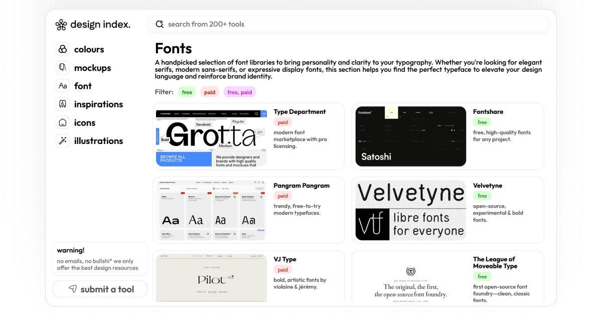 Design Index is a comprehensive collection of the best design resources available on the internet. This platform serves as a one-stop destination for designers seeking high-quality tools and materials to enhance their creative projects. Whether you are a seasoned designer or just starting out, Design Index offers a curated selection of resources that cater to all your design needs.