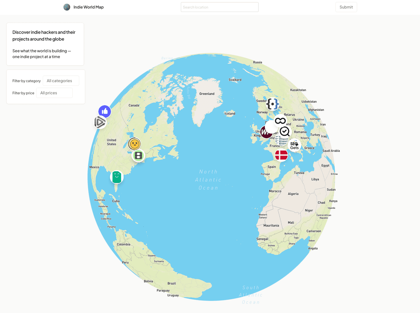 Put your project on the map — literally. Discover what indie hackers are building around the world. Add your product, share your story, and connect globally with the Indie World Map. This platform provides a beautiful 3D globe showcasing indie hackers and their projects worldwide. Whether you're a developer, designer, or entrepreneur, you can see what the world is building — one indie project at a time.
