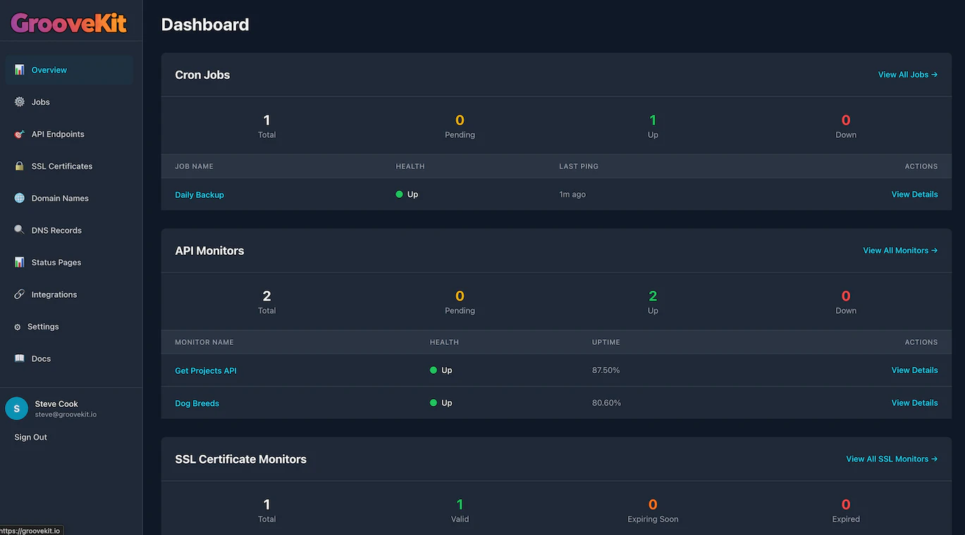 While traditional monitors check if your server is up, GrooveKit validates that your business logic is actually working. Track cron jobs, validate JSON schemas, and monitor critical DNS records - all from one UI or CLI. Built for solo founders who need to ship with confidence and sleep without alerts.