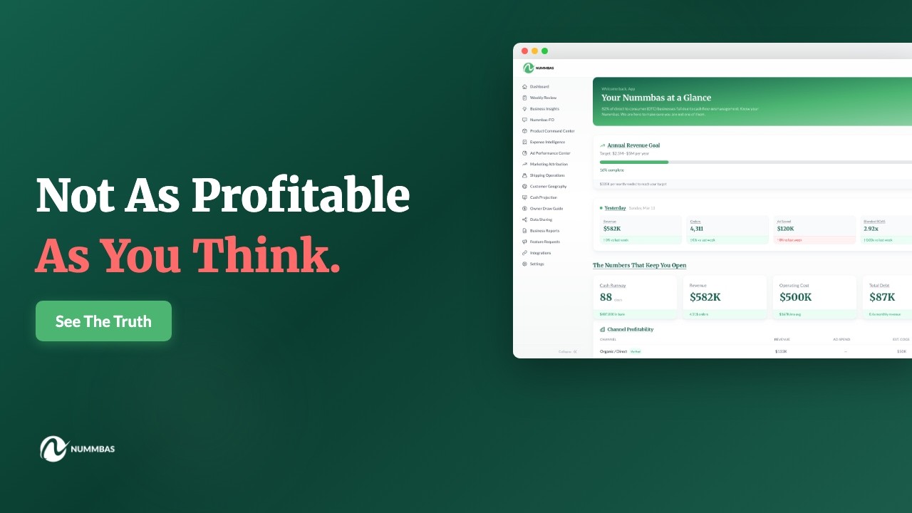 Nummbas connects your sales, ads, shipping, and accounting tools into one dashboard that shows what you actually kept after everything. An AI financial officer answers questions about your numbers instantly. 30+ automated insights catch problems before they cost you. Cash projections, industry benchmarks, owner draw guidance, and investor-ready reports are all built in. Built by a former DTC operator who shut down stores because no tool showed the full picture fast enough.
