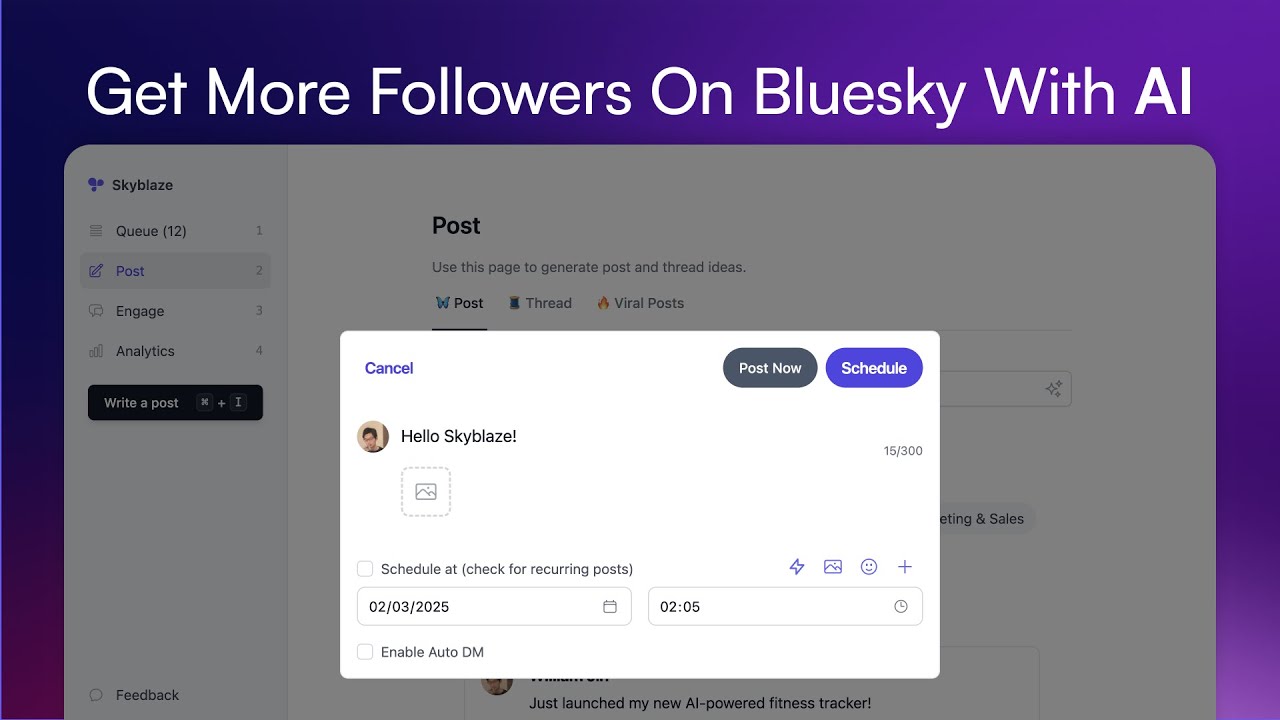 Skyblaze is an AI-powered growth and management platform designed specifically for Bluesky users. It helps creators, individuals, and businesses get more followers on Bluesky more effectively through a comprehensive suite of AI-enhanced tools.